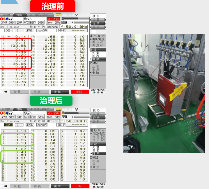 江苏某制造企业由于存在大量的LED照明灯具和可控硅调功器控制的电加热设备致使产生大量的3次谐波,N线电流最大可达500A左右,线缆和断路器发热异常,现场的生产设备受到严重影响,生产效率下降。现场18个末端治理点位,以某个末端配电箱为例进行N线治理测试。