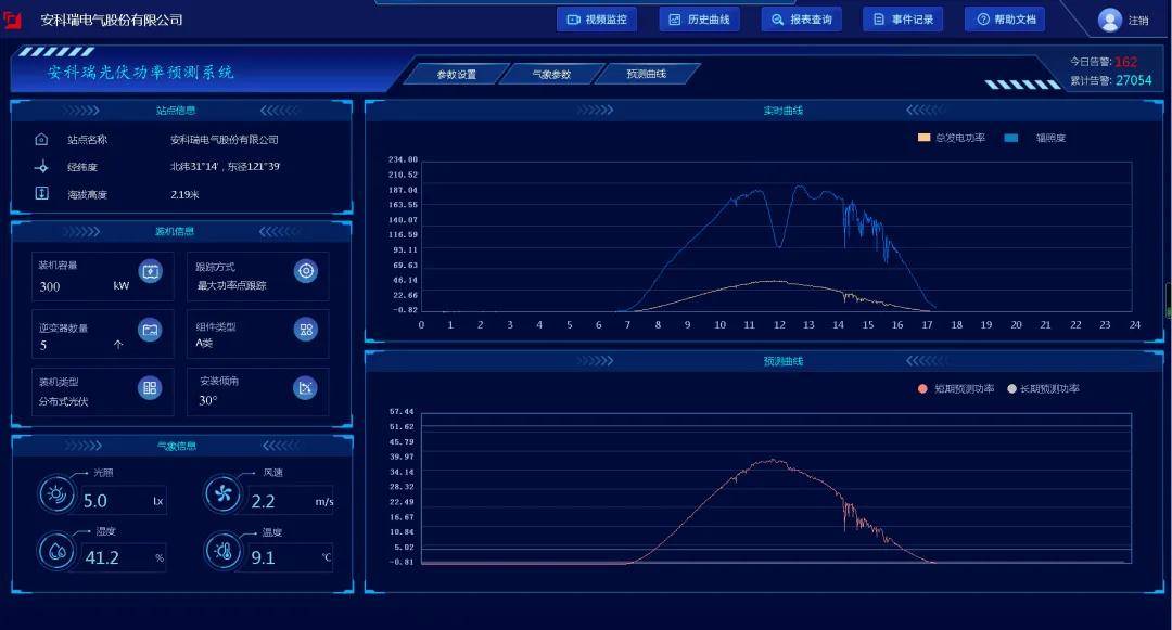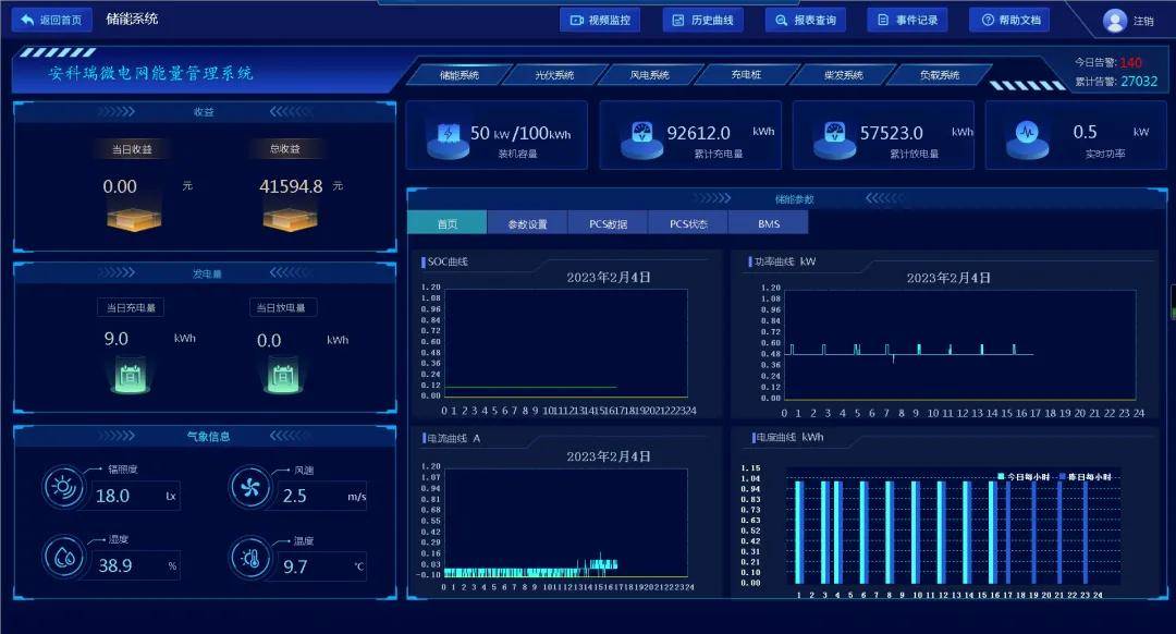 微电网能量管理系统包括系统主界面,包含微电网光伏、风电、储能、充电桩及总体负荷情况,体现系统主接线图、光伏信息、风电信息、储能信息、充电桩信息、告警信息、收益、环境等。