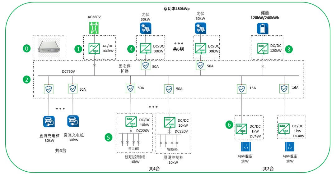 3)光伏和储能输出的电都是直流电,整个系统用直流配电系统可以减少转换,提高用电的效率;