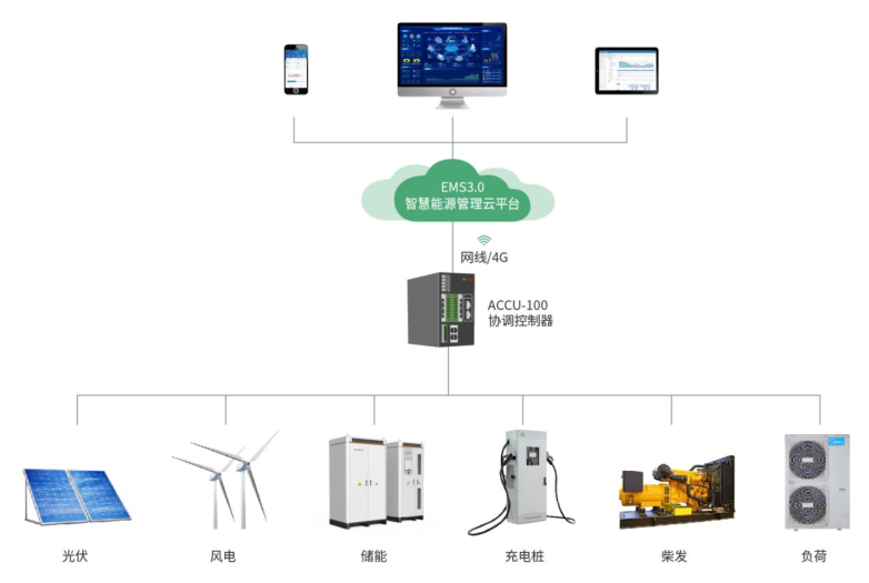 对微电网的源、网、荷、储能系统、充电负荷进行实时监控、诊断告警、全景分析、有序管理和高级控制,满足微电网运行监视全面化、安全分析智能化、调整控制前瞻化、全景分析动态化的需求,完成不同目标下光储充资源之间的灵活互动与经济优化运行,实现能源效益、经济效益和环境效益zui大化。