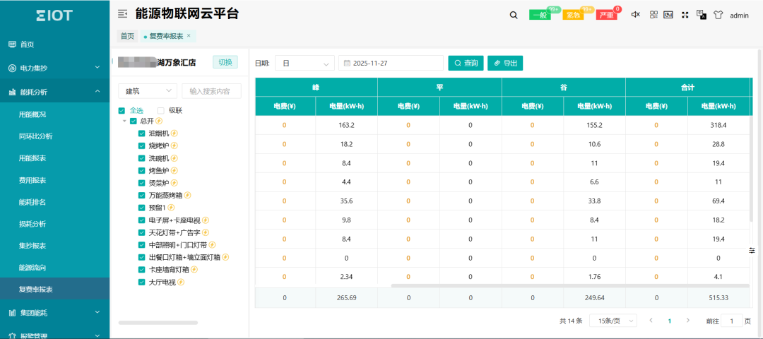 ①厨房、前厅、冷链等区域的用电精准拆分与归因;