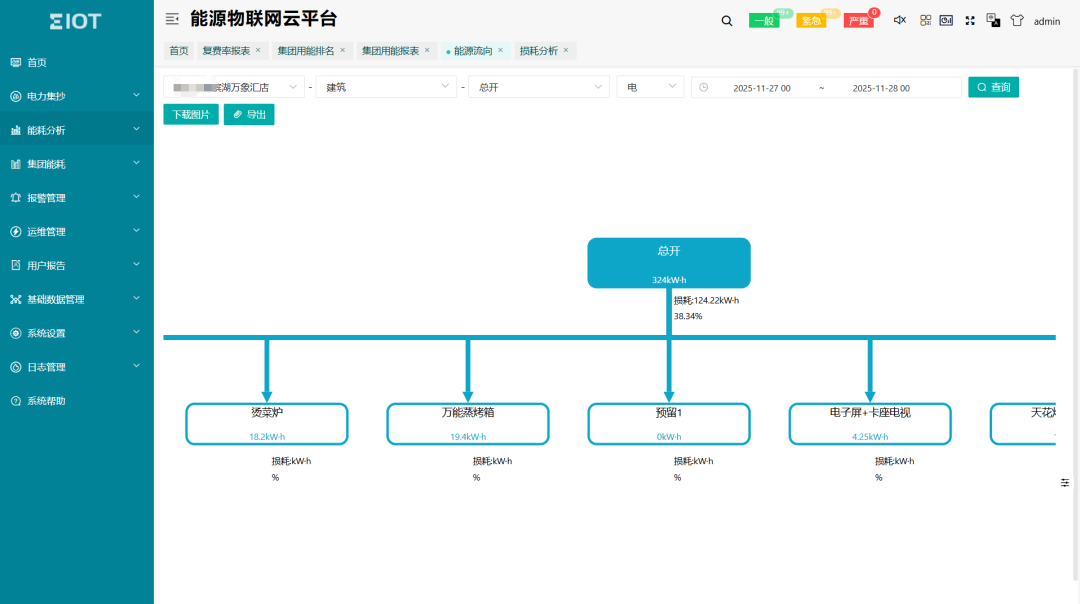 生成门店能源桑基图,直观展示用电流量及损耗;