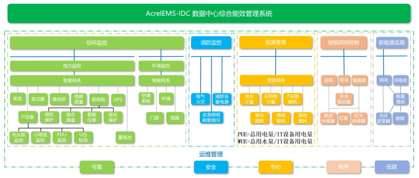 AcrelEMS-IDC数据中心综合能效管理系统为数据中心能源管理提供监测及控制,主要包括电力监控、电能质量监测和治理、能耗分析、蓄电池在线监测管理等功能,旨在实现数据中心的智能化管理,提高能源利用效率,确保电力供应的稳定和可靠性,保障电能质量和环境安全性,以及实现远程智能管理和数据分析优化,从而降低运营成本,提高数据中心的综合能效性能,并推动数据中心的可持续发展。