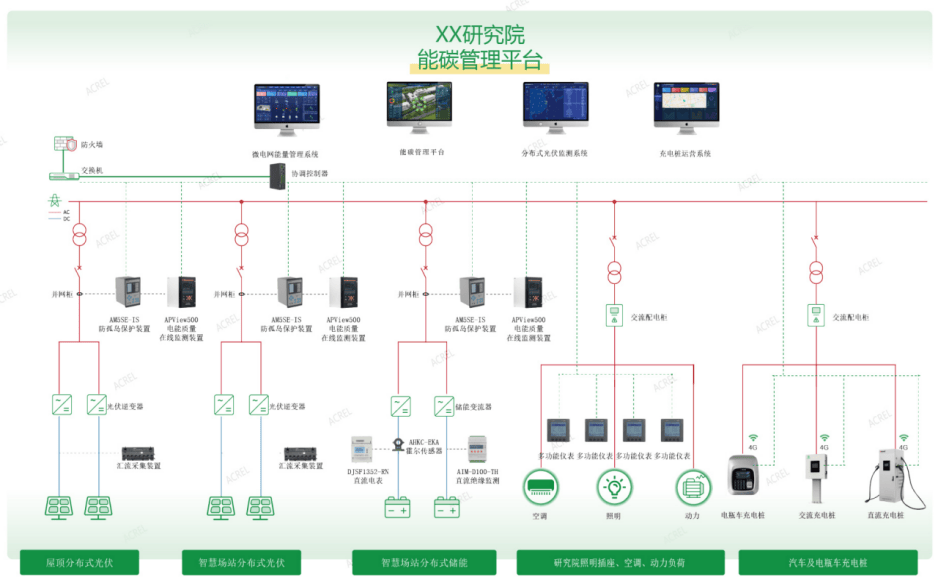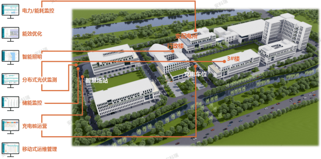 项目实施范围包括办公楼、实验室、食堂等共13栋建筑和7个电瓶车车棚以及1个智慧充电场站,实施内容包括电力监控、能耗、运维、智能照明、光伏、储能和充电桩(电瓶车+汽车),其中变压器总容量17000kVA,光伏装机容量150kW(一期),储能装机容量100kW/215kWh,39台10路电瓶车充电桩,59台7kW交流充电桩,2个240kW充电堆。