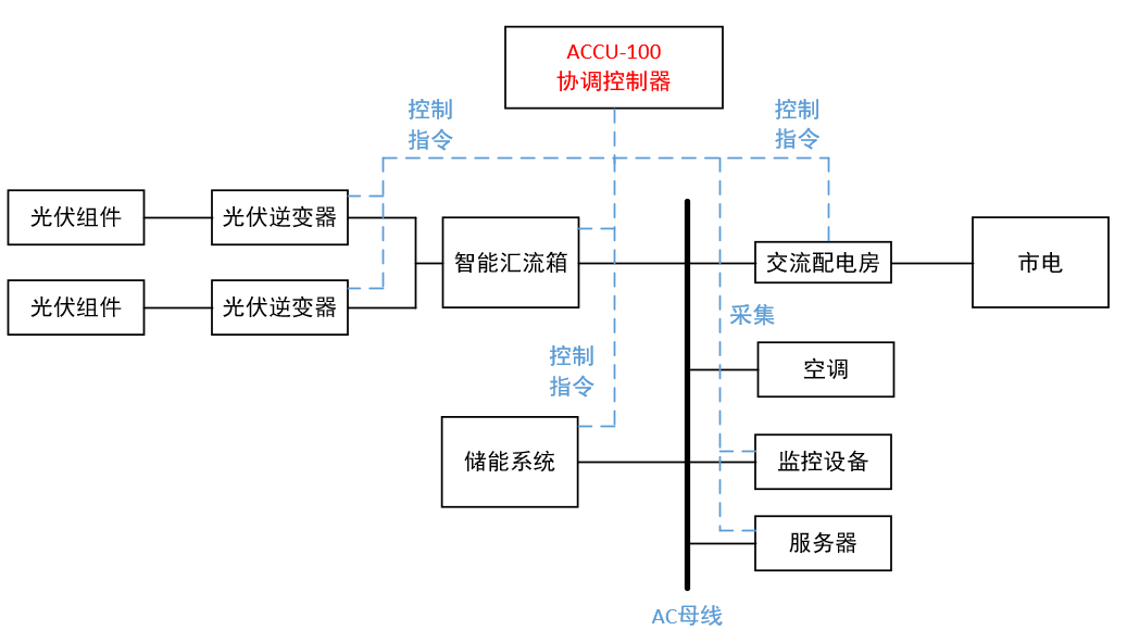 根据基站的构成以及基站设备需求,可通过 ACCU-100 协调控制器,获取基站光储系统内光伏系统的输出功率、储能状态、电价信息,调配光伏系统、市电、储能电池对所述5G 基站通信设备的供电量。其基站光储系统结构示意图如下: