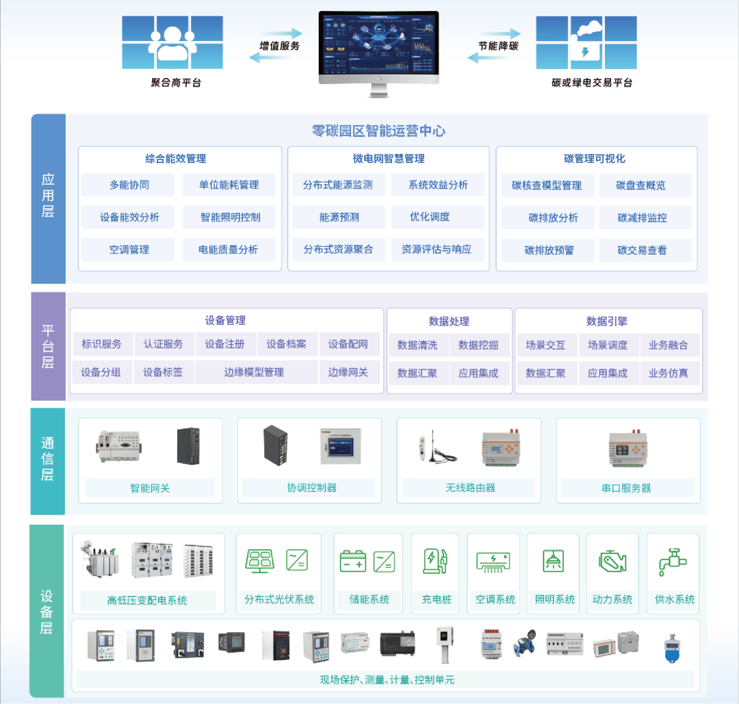 终端层:为数据核心来源,涵盖风电、逆变器、储能、充电桩、空调、余热设备及智能水电气计量表计等监测设备,实现园区源网荷储全量数据采集。