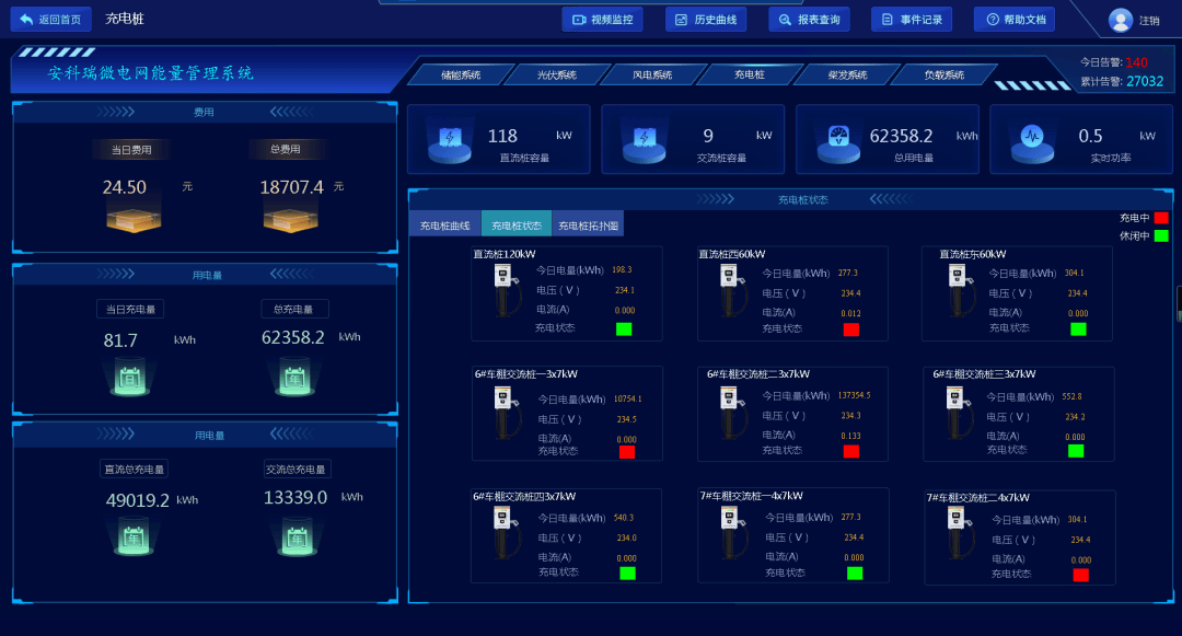 实时监测充电系统的充电电压、电流、功率及各充电桩运行状态;