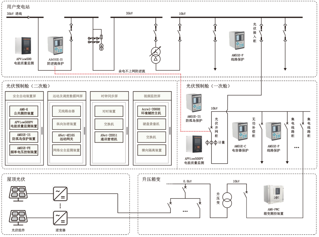 分布式光伏发电监控系统装设的电力二次部分主要有继电保护及安全自动装置,如线路保护、安全自动装置、防孤岛保护、防逆流保护等设备;